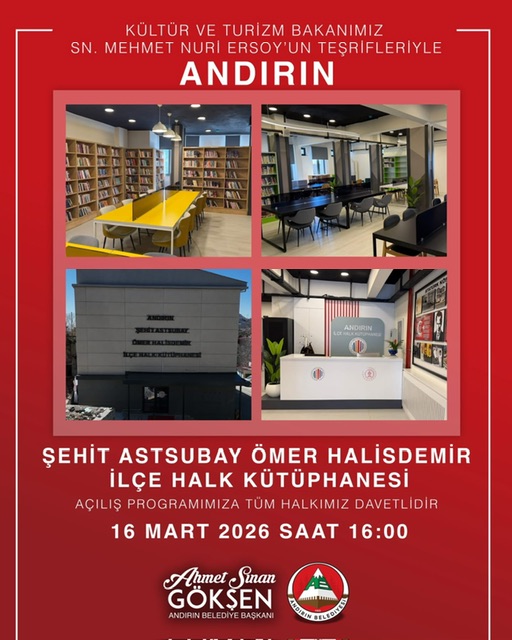 Gökşen, “Andırın’ımıza çok kıymetli bir eser daha kazandırmanın heyecanını ve mutluluğunu yaşıyoruz. Gençlerimizin, çocuklarımızın ve tüm hemşehrilerimizin bilgiyle, kitapla ve kültürle buluşacağı Şehit Astsubay Ömer Halisdemir İlçe Halk Kütüphanemizin açılışını sayın Bakanımızın katılımıyla gerçekleştireceğiz” ifadelerini kullandı.