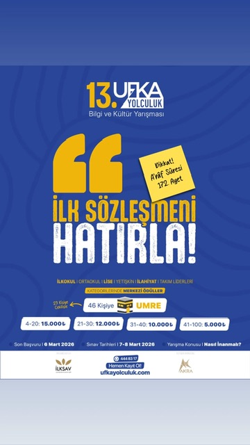 Yarışma, 7–8 Mart 2026 tarihlerinde tek aşamalı ve çoktan seçmeli sınavla gerçekleştirilecek. Dereceye girenlere çeşitli ödüller verilirken, 46 yarışmacıya Umre ödülü takdim edilecek. Organizasyon, “Gerçek ödül bilgidir” anlayışıyla katılımcıları okumaya, düşünmeye ve öğrendiklerini hayata taşımaya teşvik ediyor.