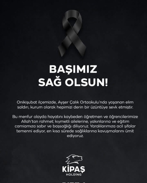 Kipaş Holding, Onikişubat ilçesindeki Ayşer Çalık Ortaokulu’nda meydana gelen ve öğretmen ile öğrencilerin hayatını kaybettiği silahlı saldırı sonrası bir taziye mesajı yayımladı.