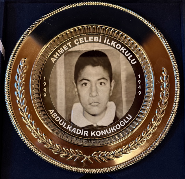 Eski mezunlardan Abdulkadir Konukoğlu’nu ağırlamanın mutluluğunu yaşadıklarını belirten Ahmet Çelebi İlkokulu Müdürü Erol Taşdemir, Konukoğlu’na, üzerinde okul kütüğündeki mezuniyet fotoğrafı bulunan plaket takdim etti.