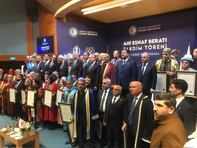 Ticaret Bakanı Prof. Dr. Ömer Polat, Türkiye Esnaf ve Sanatkarlar Konfederasyonu Başkanı Bendevi Palandöken, Türkiye Esnaf ve Sanatkarlar Kredi ve Kefalet Kooperatifleri Birliği Genel Başkanı Abdulkadir Akgül, Esnaf ve Sanatkarlar Kooperatifçilik Genel Müdürü Taha Esnes Şener, Kahramanmaraş Esnaf ve Sanatkarlar Odaları Birliği Başkanı Ahmet Kuybu ve Terziler Konfeksiyoncular Odası Başkanı, Birlik Yönetim Kurulu Üyesi Muhlis Akkurt’un katılımıyla Ankara’da “Ahi Esnaf Beratı Takdim Töreni” gerçekleştirildi.
