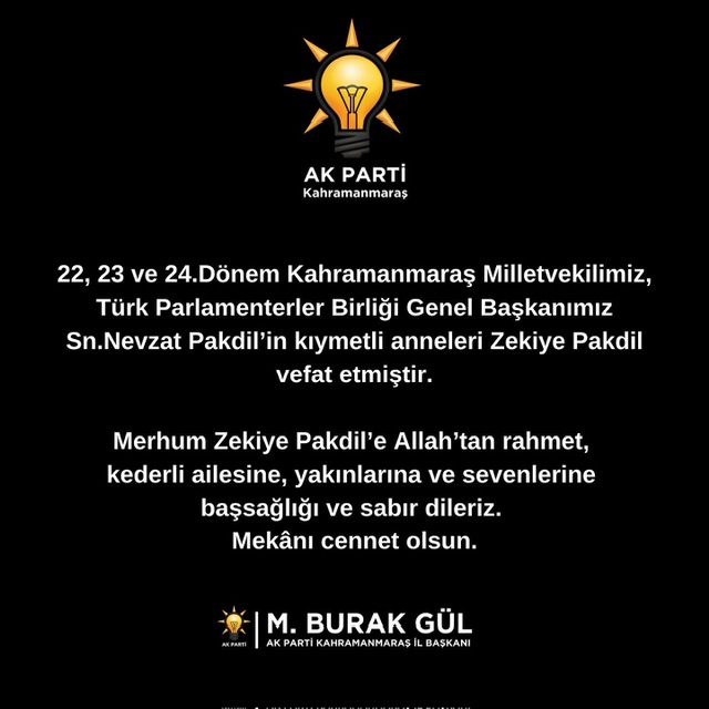 AK Parti Kahramanmaraş İl Başkanı M. Burak Gül, Türk Parlamenterler Birliği Genel Başkanı ve 22, 23 ve 24. Dönem Kahramanmaraş Milletvekili Nevzat Pakdil’in annesi Zekiye Pakdil’in vefatı dolayısıyla başsağlığı mesajı yayımladı.