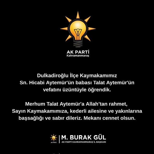 AK Parti İl Başkanı Av. M. Burak Gül, Dulkadiroğlu İlçe Kaymakamı Hicabi Aytemür’ün babası Talat Aytemür’ün vefatına ilişkin taziye mesajı yayımladı.