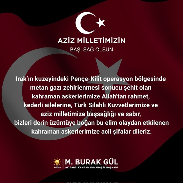 AK Parti Kahramanmaraş İl Başkanı M. Burak Gül, Irak’ın kuzeyindeki Pençe-Kilit operasyon bölgesinde görevlerini ifa ederken metan gazı zehirlenmesi sonucu şehit olan askerlerimiz için taziye mesajı yayımladı.