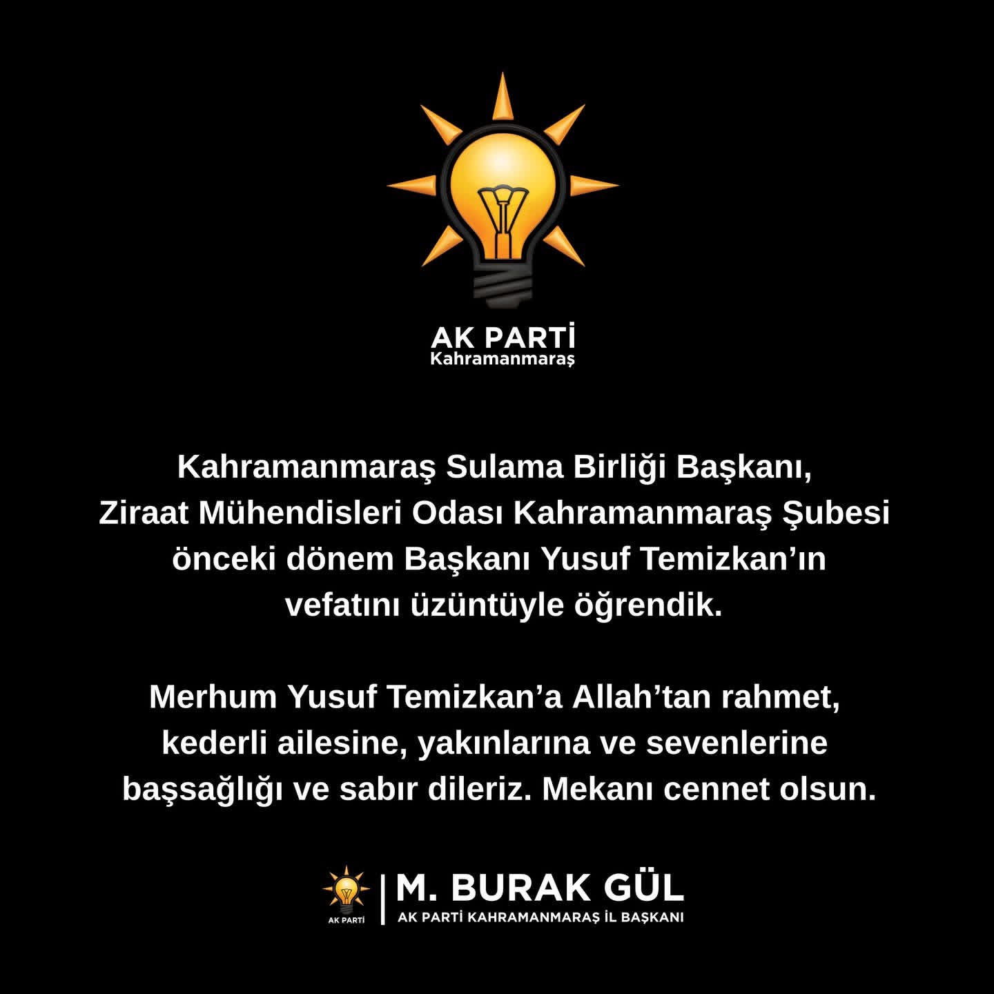 AK Parti Kahramanmaraş İl Başkanı M. Burak Gül, Kahramanmaraş Sulama Birliği Başkanı ve Ziraat Mühendisleri Odası Kahramanmaraş Şubesi önceki dönem Başkanı Yusuf Temizkan’ın vefatı dolayısıyla bir taziye mesajı yayımladı.
