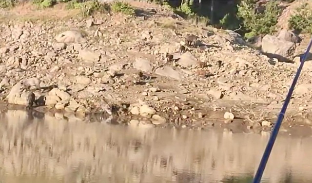 Kahramanmaraş’ın Andırın ilçesinde, balıkçıların baraj kenarında olta balıkçılığı yaptığı sırada ormanlık alandan yavrularıyla birlikte beliren yaban domuzu sürüsü dikkatlerin üzerine çekti.