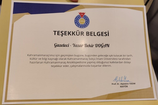 Kahramanmaraş Gazetesi ve www.kahramanmarasgazetesi.com.tr internet haber sitesi sahibi, gazeteci-yazar Bekir Doğan, Kahramanmaraş Ansiklopedisi’ne yazar olarak verdiği destek ve şehre kazandırdığı değerli eserler nedeniyle teşekkür plaketiyle onurlandırıldı.