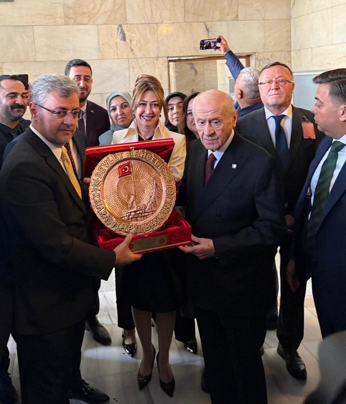 Toplantı sonrasında MHP Kahramanmaraş Milletvekili Doç. Dr. Zuhal Karakoç ile birlikte hareket eden İl Başkanı Metehan, bakır üzerine işlenmiş, Kahramanmaraş’ın simgesi olan bayrak tutan bozkurt figürünü MHP Lideri Devlet Bahçeli’ye hediye etti.