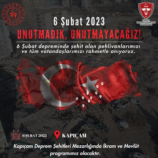 “6 Şubat 2023 depremini unutmadık, unutmayacağız! Bu büyük felakette hayatını kaybeden pehlivanlarımızı ve tüm vatandaşlarımızı rahmetle anıyoruz. Onların aziz hatıralarını yaşatmak ve ruhlarına dua etmek amacıyla 6 Şubat 2025’te Kapıçam Deprem Şehitliği’nde mevlit programı düzenleyeceğiz. Tüm vatandaşlarımızı bu anlamlı programa davet ediyoruz.”