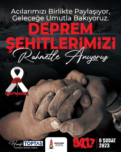11 ilde yıkıma neden olan Kahramanmaraş merkezli depremlerin 3’üncü yıl dönümü dolayısıyla anma mesajı yayımlayan Onikişubat Belediye Başkanı Hanifi Toptaş, deprem şehitlerini dualarla yâd ettiklerini belirterek, deprem sonrası yapılan çalışmalara ilişkin bilgiler verdi.