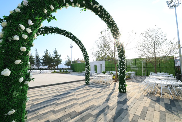 Salonun çevresinde yer alan fotoğraf çekim alanları, yürüyüş yolları, süs havuzları ve otopark düzenlemeleri, misafirlere huzurlu ve konforlu bir deneyim sunacak şekilde planlandı. Özellikle doğanın içinde, açık havada düğün yapmak isteyen çiftler için ideal bir ortam oluşturuldu. Geniş sahne ve dans alanı, güçlü ses sistemi ve modern aydınlatma teknolojileriyle desteklenen tesis, her detayıyla unutulmaz organizasyonlara ev sahipliği yapacak.