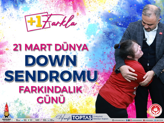 21 Mart Down Sendromlular Günü vesilesiyle +1 farkla dünyaya gelen özel gereksinimli bireylerimizin ayrımcılığa ve olumsuz tutumlara maruz kalmasını önlemek, erken eğitimle sosyal hayata kazandırılabileceklerinin farkına varmak ve hayatlarını bir birey olarak sürdürebilmelerini sağlamak için hepimize çok önemli görevler düşmektedir. Bilinmelidir ki onlar diğer bireylerin sahip oldukları her hakka sahiptirler. Onikişubat Belediyesi olarak ayırt etmeksizin bütün insanlarımızı yaratılmış en önemli varlıklar olarak görüyor ve bu yönde çalışmalar yürütüyoruz. Bu anlamda sadece Dünya Down Sendromlular Günü’nde değil, bütün çalışmalarımızda özel gereksinimli kardeşlerimizi merkez konumda yapılandırıyor, farkındalık yaratmak için önemli projeler hayata geçiriyoruz. Biliyoruz ki onlar, enerjileri, yaşam sevgileri ve eğlenceli taraflarıyla çevresindeki insanlara ve topluma örnek kimselerdir. Onikişubat Belediyemizin bünyesindeki Hamidiye Bekir Topçuoğlu Özel Eğitim ve Rehabilitasyon Merkezi’miz, şehrimizdeki bütün downsendromlu kardeşlerimizin tüm ihtiyaçlarını karşılamak üzere çalışmalarına devam etmektedir.