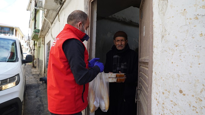 koşullarda hazırlanan yemekler, paketlenerek ekipler aracılığıyla kapı kapı ulaştırılıyor. Her