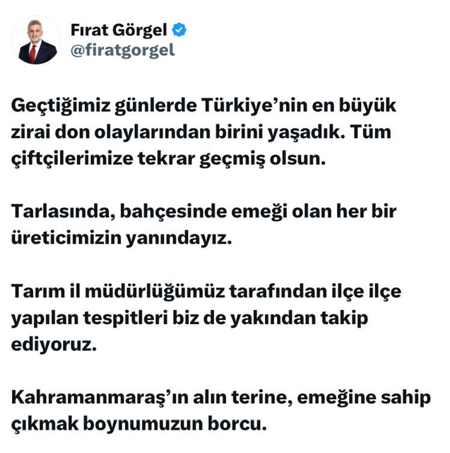 Büyükşehir Belediye Başkanı Fırat Görgel de yaşanan don felaketine ilişkin bir açıklama yaptı. Türkiye’nin son yıllardaki en büyük zirai don olaylarından birinin yaşandığını ifade eden Görgel, “Tüm çiftçilerimize tekrar geçmiş olsun. Tarlasında, bahçesinde emeği olan her bir üreticimizin yanındayız. Tarım İl Müdürlüğümüz tarafından ilçe ilçe yapılan tespitleri biz de yakından takip ediyoruz. Kahramanmaraş’ın alın terine, emeğine sahip çıkmak boynumuzun borcudur” dedi.