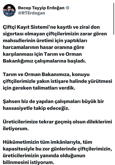 Sosyal medya hesabı üzerinden paylaşımda bulunan Cumhurbaşkanı Erdoğan, Tarım ve Orman Bakanlığının, Çiftçi Kayıt Sistemi’ne kayıtlı ancak zirai don sigortası olmayan üreticilerin zararlarının karşılanması için harekete geçtiğini belirtti. Erdoğan, “Tarım ve Orman Bakanımıza, konuyu çiftçilerimizle yakın istişare halinde yürütmesi için gereken talimatları verdik. Şahsen biz de yapılan çalışmaları büyük bir hassasiyetle takip edeceğiz. Hükûmetimizin tüm imkânlarıyla bu zor günlerinde çiftçilerimizin yanında olduğunun bilinmesini istiyorum” dedi.