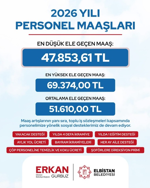 Başkan Gürbüz yaptığı açıklamada, Elbistan Belediyesi bünyesinde görev yapan tüm personelin, kentin gelişimi ve vatandaşlara sunulan hizmetlerin temel taşı olduğunu belirtti. Gürbüz, “Çalışma arkadaşlarımızın emeğini koruyan, refahını artıran ve sosyal haklarını güçlendiren bir yönetim anlayışıyla hareket ediyoruz. 2026 yılı maaş düzenlemelerimizin tüm personelimize hayırlı olmasını diliyorum” dedi.
