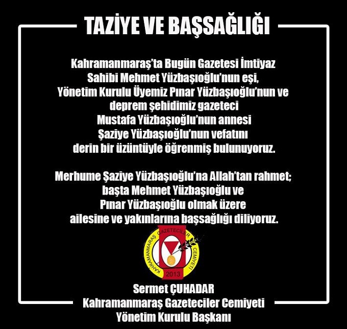Kahramanmaraş’ta Bugün Gazetesi İmtiyaz Sahibi Mehmet Yüzbaşıoğlu’nun eşi, Kahramanmaraş Gazeteciler Cemiyeti Yönetim Kurulu Üyesi Pınar Yüzbaşıoğlu ile depremde hayatını kaybeden gazeteci Mustafa Yüzbaşıoğlu’nun annesi Şaziye Yüzbaşıoğlu’nun vefatı büyük üzüntü yarattı.