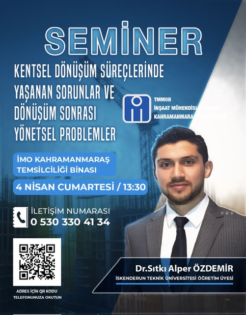 Bir diğer etkinlikte ise Sıtkı Alper Özdemir, “Kentsel Dönüşüm Süreçlerinde Yaşanan Sorunlar ve Dönüşüm Sonrası Yönetsel Problemler” başlıklı seminerle bilgi ve deneyimlerini aktaracak. Seminerde özellikle dönüşüm sürecinde karşılaşılan yapısal ve yönetsel sorunlara dikkat çekilmesi bekleniyor.