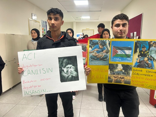 Etkinlik boyunca Filistin’de hayatını kaybeden çocuklara ithafen bildiriler okundu. Öğrenciler, sınıflarına dönmeden önce ellerinde taşıdıkları barış ve adalet mesajlarıyla güçlü bir birliktelik sergiledi.
