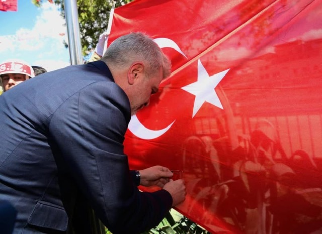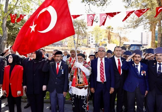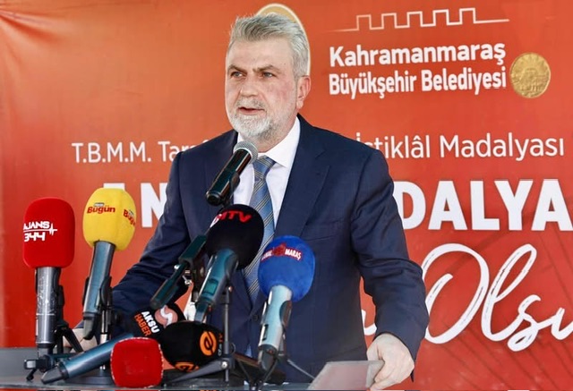 Çelenk sunumunun ardından, Büyükşehir Belediye Başkanı Fırat Görgel, Kahramanmaraş’ın onuru olan Kırmızı Şeritli İstiklal Madalyası’nı Türk Bayrağı’na taktı. Bu anlamlı an, alanda bulunan vatandaşlar tarafından büyük bir coşkuyla karşılandı.