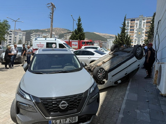 Kahramanmaraş (SHA)- Kahramanmaraş’ta sürücüsü kontrolünü kaybettiği otomobiliyle park halindeki araçlara çarparak ters döndü.