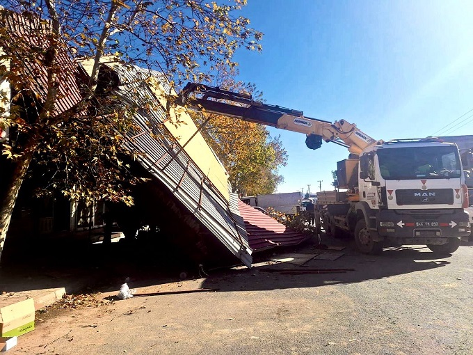 kişilik ekiple, bir yandan devrilen ağaçlar kaldırılırken bir yandan da tehlike oluşturan çatı ve