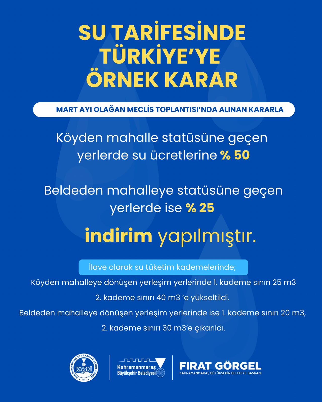Hayata geçirilen bu uygulamayla Kahramanmaraş, Türkiye’de bir ilke imza attı. Köy ve beldeden mahalleye dönüşen yerleşim yerlerine yönelik su tarifelerinde yerel yönetim inisiyatifiyle yapılan bu kapsamlı düzenleme Türkiye’de ilk kez Kahramanmaraş’ta uygulanacak.