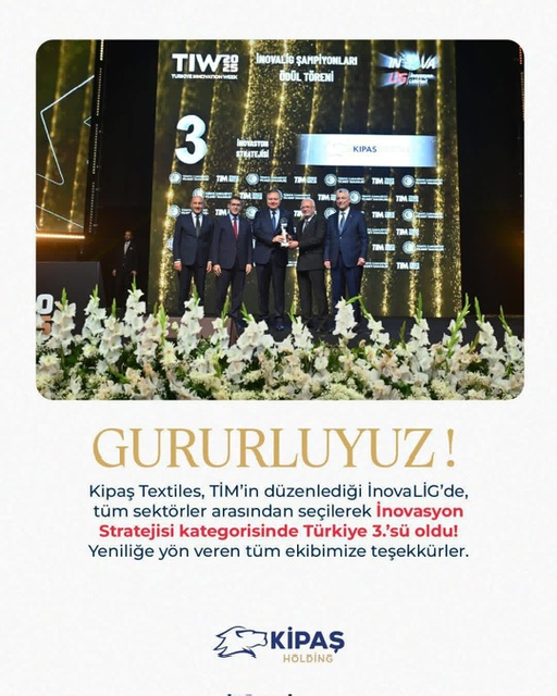 “Türkiye’nin en büyük inovasyon platformu olan İnovaLİG 2025’te, yaklaşık 3.000 firma arasından seçilerek İnovasyon Stratejisi Kategorisinde Türkiye 3.’sü olduk. Ticaret Bakanımız Sn. Ömer Bolat, Çalışma ve Sosyal Güvenlik Bakanımız Sn. Vedat Işıkhan ve TİM Başkanımız Sn. Mustafa Gültepe tarafından takdim edilen bu anlamlı ödül, Kipaş Tekstil olarak inovasyona olan bağlılığımızın en değerli göstergesi oldu. Tekstil sektöründe dereceye giren tek firma olmanın gururunu yaşıyoruz. Bu başarıya emek veren tüm ekip arkadaşlarımıza içten teşekkürlerimizi sunuyoruz.”