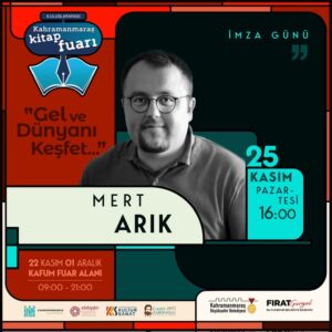 Söyleşilerin yanı sıra, okurlarıyla birebir iletişim kurmak isteyen yazarlar da imza günlerinde yer alıyor. Bu kapsamda Mert Arık, 25 Kasım Pazartesi günü 16.00 ile 18.00 saatleri arasında düzenlenecek imza günü etkinliğinde kitaplarını okurları için imzalayacak. Yalnızca söyleşi ve imza etkinlikleriyle değil, aynı zamanda çeşitli kültürel ve sanatsal programlarla da zengin bir içerik sunan 9. Uluslararası Kahramanmaraş Kitap Fuarı’na tüm vatandaşlar davet edildi.