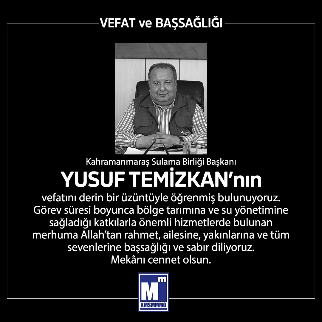 Kahramanmaraş Serbest Muhasebeci Mali Müşavirler Odası (KMSMMMO) Başkanı Abdullah Kalın, Kahramanmaraş Sulama Birliği Başkanı Yusuf Temizkan’ın vefatı dolayısıyla bir taziye mesajı yayımladı. Kalın, Temizkan’ın vefat haberini derin bir üzüntüyle öğrendiklerini ifade etti.