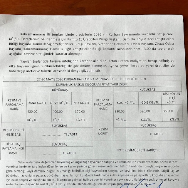 • Kurbanlık Fiyatları Açıklandı: Kahramanmaraş’ta 2026 Bayram Tarifesi Belli Oldu