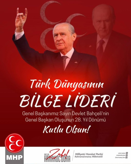Milliyetçi Hareket Partisi (MHP) Kahramanmaraş Milletvekili Doç. Dr. Zuhal Karakoç Dora, MHP Genel Başkanı Devlet Bahçeli’nin genel başkanlığa gelişinin 28. yıl dönümü dolayısıyla bir kutlama mesajı yayımladı. Dora, mesajında Türk-İslam ülküsüne ve Türk milletine adanmış bir ömrün simgesi olarak nitelendirdiği Bahçeli’ye duyduğu bağlılığı vurguladı.