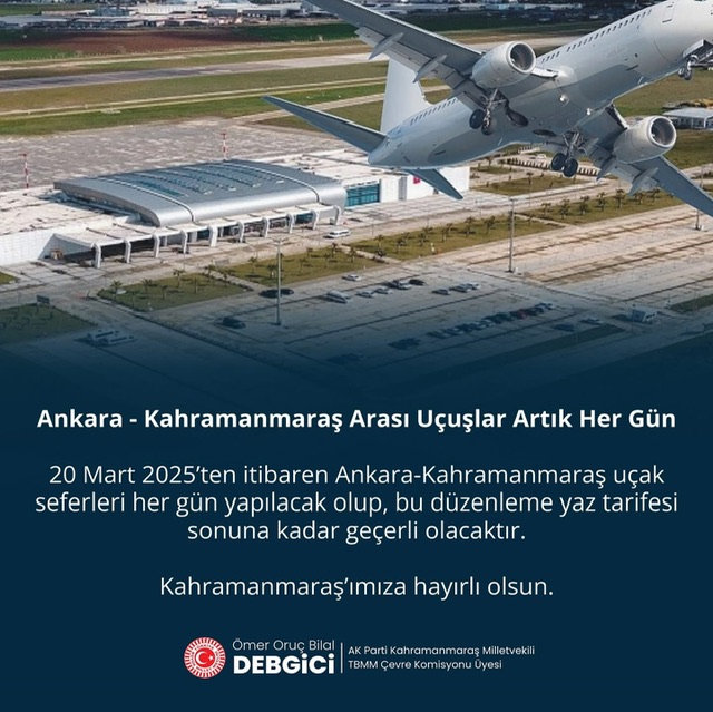 AK Parti Kahramanmaraş Milletvekili Ömer Oruç Bilal Debgici, Ankara – Kahramanmaraş uçak seferlerinin artık her gün yapılacağını duyurdu. Yeni düzenleme, 20 Mart 2025 itibarıyla başlayacak ve yaz tarifesi sonuna kadar devam edecek.
