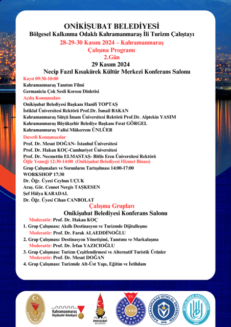 Onikişubat Belediyesi’nin ev sahipliğindeki Bölgesel Kalkınma Odaklı Kahramanmaraş Turizm Çalıştayı, 28-29 ve 30 Kasım tarihlerinde Kahramanmaraş Valiliği, Kahramanmaraş Büyükşehir Belediye Başkanlığı, Kahramanmaraş Sütçü İmam Üniversitesi, Kahramanmaraş İstiklal Üniversitesi ve Bitlis Eren Üniversitesi’nin destekleriyle gerçekleştirilecek.