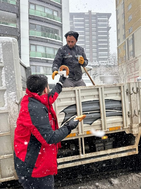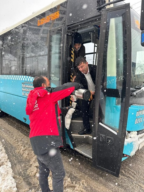 Kar yağışının etkili olduğu saatlerde harekete geçen belediye ekipleri; halk otobüslerinde, duraklarda bekleyen vatandaşlara ve sahada fedakârca görev yapan karla mücadele personeline sıcak çay ve simit ikram ederek hem moral verdi hem de içleri ısıttı.