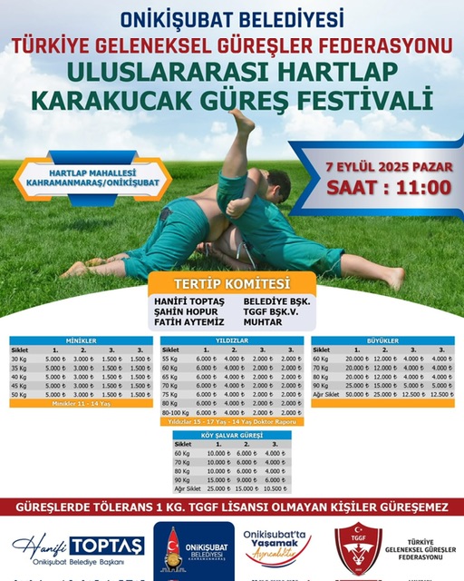 Bu yıl ise Uluslararası Hartlap Karakucak Güreş Festivali ilegüreşin nabzını Kahramanmaraş’ta attıracak olan OnikişubatBelediyesi, 7 Eylül 2025 Pazar günü saat 11.00’de HartlapMahallesi’nde düzenlenecek olan festivalde yine binlerce güreşseveri buluşturacak.