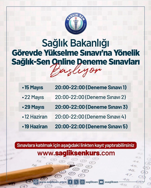 Online deneme sınavlarına katılmak isteyenlerin, www.sagliksenkurs.com adresine girerek “Eğitimlerimiz” bölümünde yer alan kayıt formunu doldurmaları gerekiyor. Sınav günü ise katılımcılar, kayıt sırasında kullandıkları e-posta adresi ve şifre ile aynı site üzerinden “Sınavlar” bölümüne giriş yaparak deneme sınavlarına erişebilecekler.