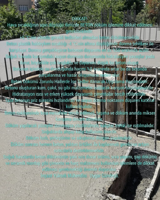 Açıklamada, sadece beton dökümünün değil, aynı zamanda duvar örümü, sıva yapımı, şap dökümü ve seramik montajı gibi çimento ve harç kullanılan işlemlerin de soğuk hava şartlarında dikkatle yapılması gerektiği vurgulandı.