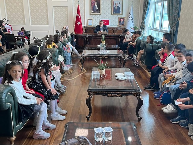 23 Nisan etkinlikleri kapsamında Kahramanmaraş Hasan Balcı İlkokulu 2. sınıf öğrencileri Türkoğlu Belediyesi’ni ziyaret etti. Başkan Mehmet Karaca, minik misafirlerini belediye binasında ağırladı.