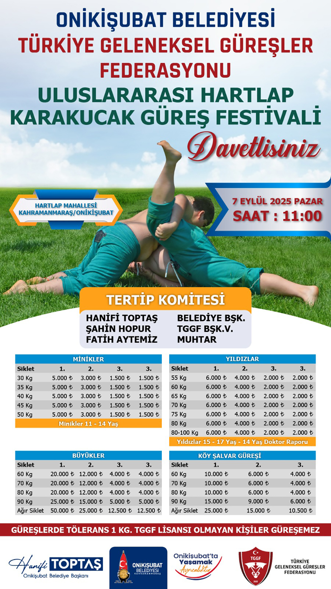 Onikişubat Belediyesi ve Türkiye Geleneksel Güreşler Federasyonu (TGGF) iş birliğiyle düzenlenen Uluslararası Hartlap Karakucak Güreş Festivali, yarın Kahramanmaraş’ın Onikişubat ilçesinde gerçekleştirilecek. Festival, hem ulusal hem de uluslararası düzeyde güreşseverleri bir araya getirecek.